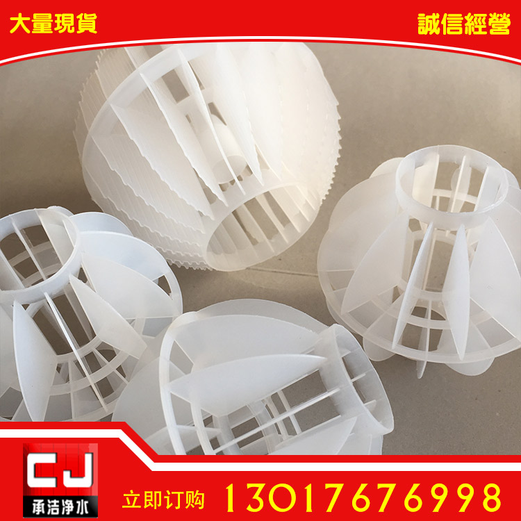 多面空心球填料,在球的中部沿整個周長有一道加固環(huán),在環(huán)的上下各有十二片球瓣。上下球瓣互相交錯,沿中心軸呈放射形布置。我廠在有關(guān)生產(chǎn)工程塑料的單位幫助下,總結(jié)經(jīng)驗,證實多面空心球填料具有如下優(yōu)點(diǎn):由于表面積大;傳質(zhì)效率高,產(chǎn)品的球瓣與球瓣之間空間大,且重量輕、強(qiáng)度大、安裝方便、耐高溫(在140℃的環(huán)境中不變形),因此它在廢氣凈化、脫硫、脫二氧化碳?xì)怏w、廢水處理等行業(yè)中得到廣泛應(yīng)用。